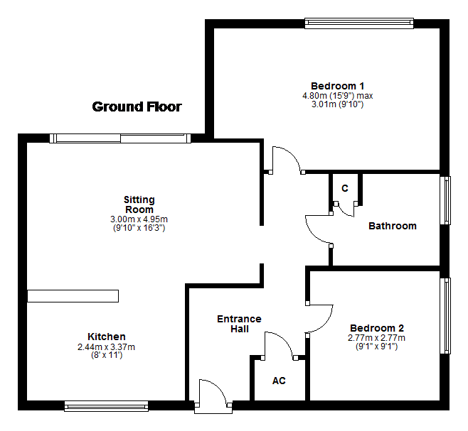 Bedroom 2 - 9' 1'' x 9' 1'' (2.77m x 2.77m) A small double or single bedroom with a double glazed window to the front and built in cupboards. Fitted carpet and electric heater.