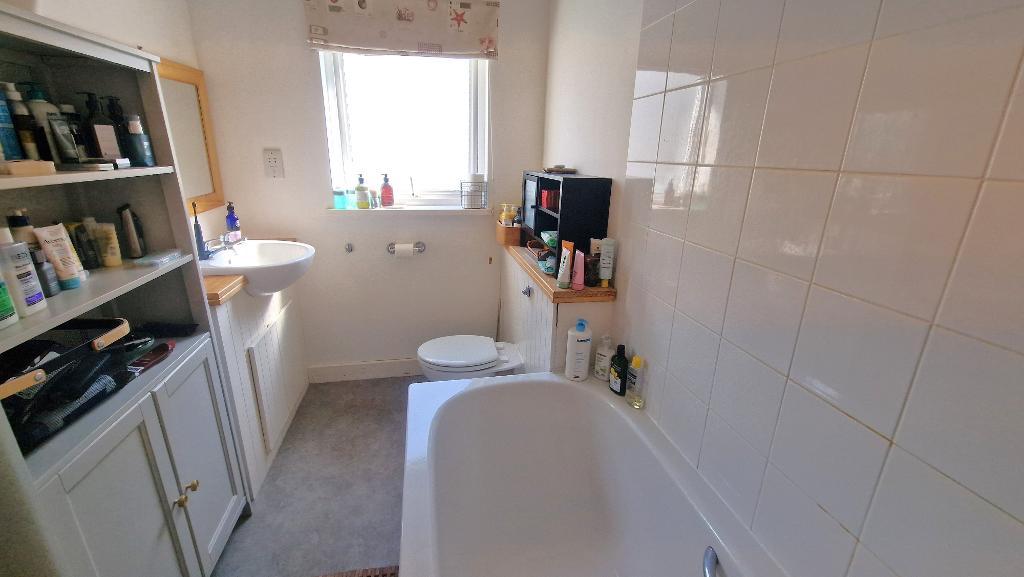 Bathroom - Fitted with a panelled bath, a wash basin set in a vanity unit and a WC set in a vanity unit. Obscured double glazed window to the rear. Built in cupboard, extractor fan, radiator and vinyl flooring.