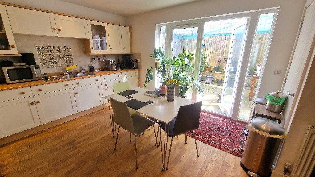 Outside - French doors from the kitchen diner lead out into a southerly aspect rear garden. The garden has been paved for ease of maintenance, making it the perfect spot for outside dining, and incorporates raised flower beds.