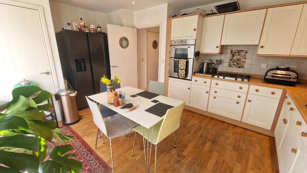 Kitchen Dining Room - 11' 8'' x 15' 5'' (3.58m x 4.72m) Fitted with a range of wall and floor units with work surfaces over, an inset sink unit and tiled surrounds. Built in gas hob with a cooker hood over, and an eye level electric oven. Space for an American style fridge freezer. Double glazed French doors and side windows giving access to the rear garden. Space for a dining table and chairs. Cupboard housing a gas boiler and a hot water cylinder. Radiator and wood flooring.