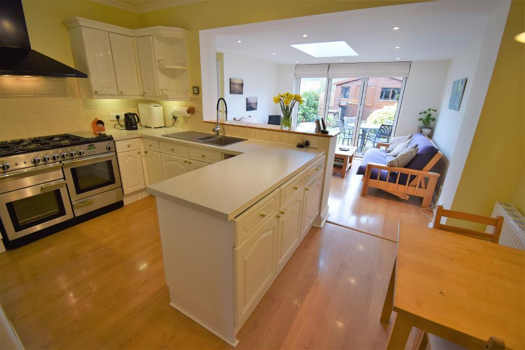 Kitchen - 9' 8'' x 14' 4'' (2.97m x 4.37m) Fitted with a range of wall and floor units with work surfaces over, a composite 1.5 bowl sink unit and tiled surrounds. Space for a range style cooker with a cooker hood over, space for a fridge freezer, and space for a table and chairs. Tall built in storage cupboard, window to the side and wood effect flooring. Wall mounted Vaillant gas boiler, installed in 2019. Open onto: