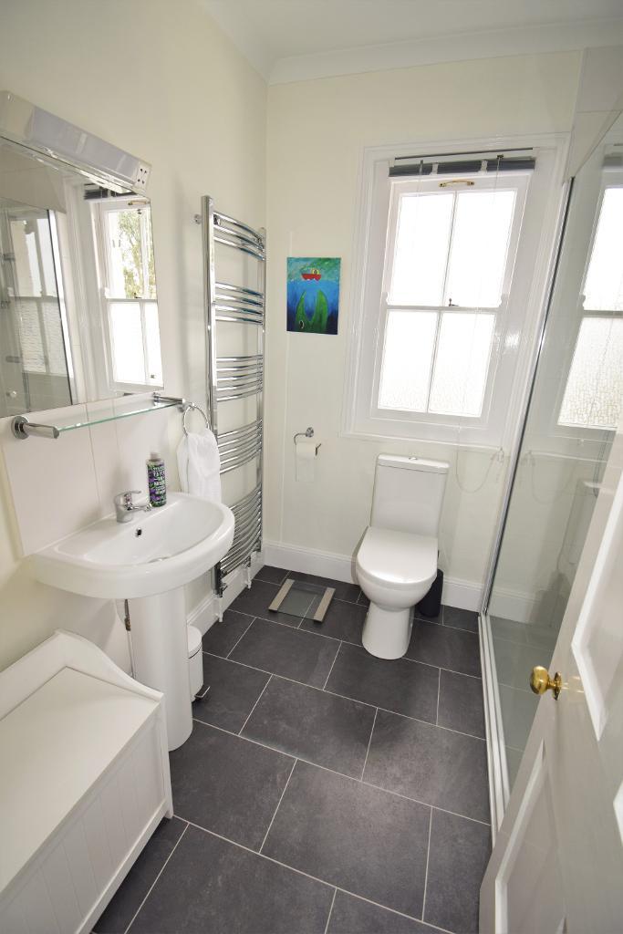 Shower Room - 6' 5'' x 6' 8'' (1.97m x 2.04m) Fitted with a modern white suite comprising double sized shower cubicle with a glass screen, wash basin and WC. Heated towel rail, sash window to the rear, vinyl flooring and tiled splashbacks.