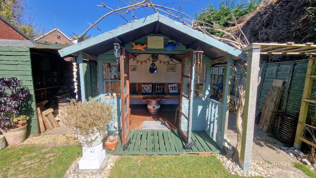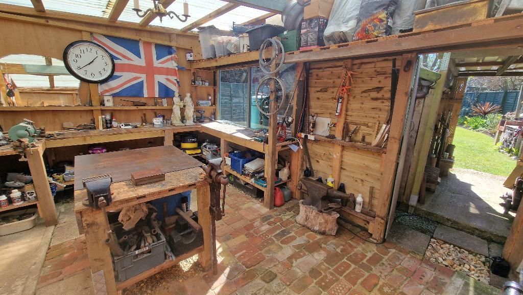 The outbuildings include a timber potting shed, a timber summer house, and 2 workshops with electricity.