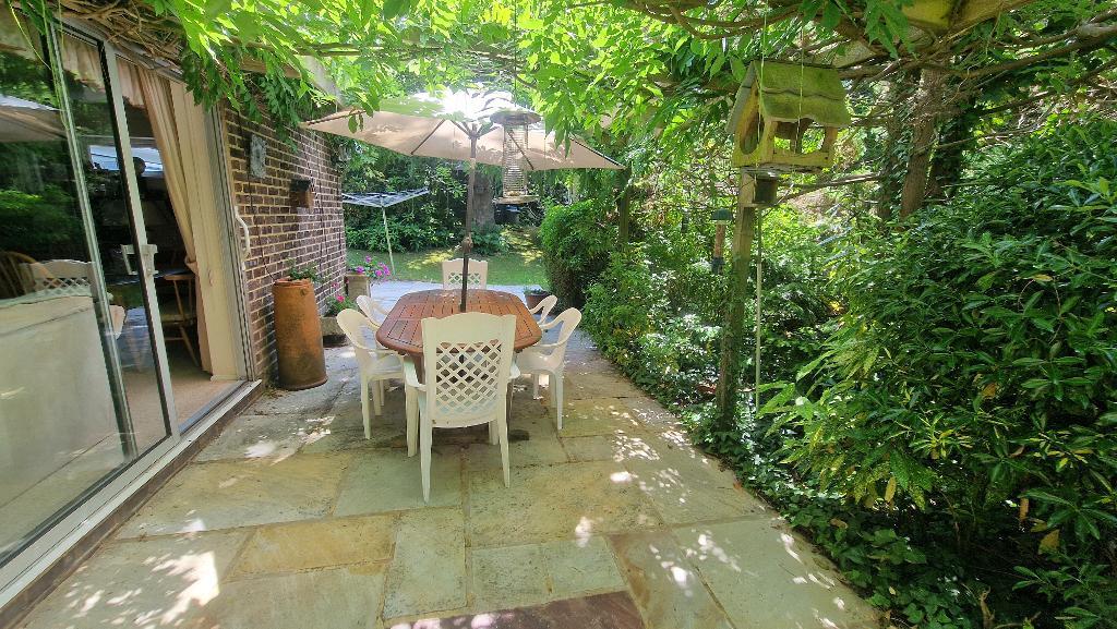 The outbuildings include a timber potting shed, a hexagonal timber summer house, and a greenhouse.