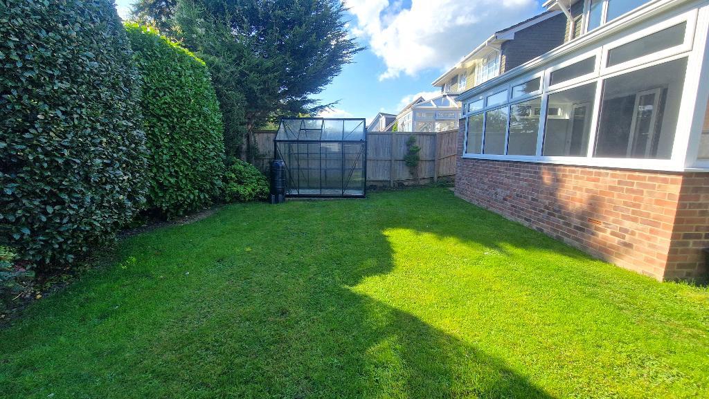 Gated side access leads through to an enclosed rear garden, which is laid to lawn with planted shrub borders.