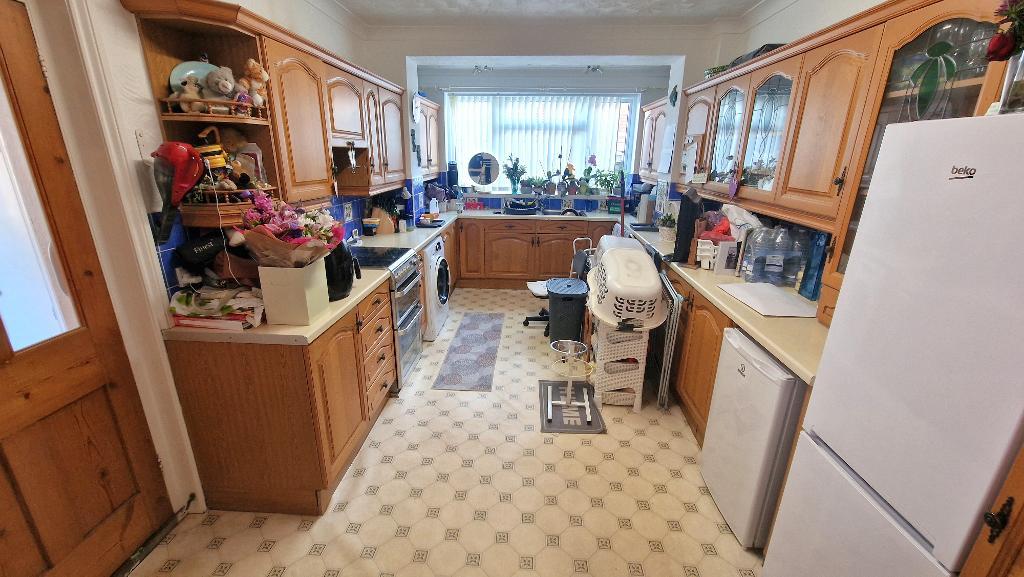 Kitchen - 17' 1'' x 10' 0'' (5.23m x 3.05m) Fitted with a range of wall and floor units with work surfaces over, an inset sink unit and tiled surrounds. Gas cooker point, plumbing for a washing machine, space for a fridge freezer and space for an under counter fridge. Double glazed window to the rear. Radiator and vinyl flooring. Door to:
