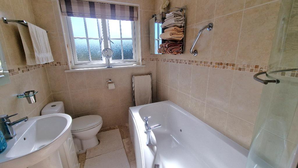 Bathroom - Fitted with a panelled bath with a shower over and a glass screen, a wash basin and a WC. Obscured double glazed window to the rear. Extractor fan, heated towel rail, fully tiled walls and tiled flooring.