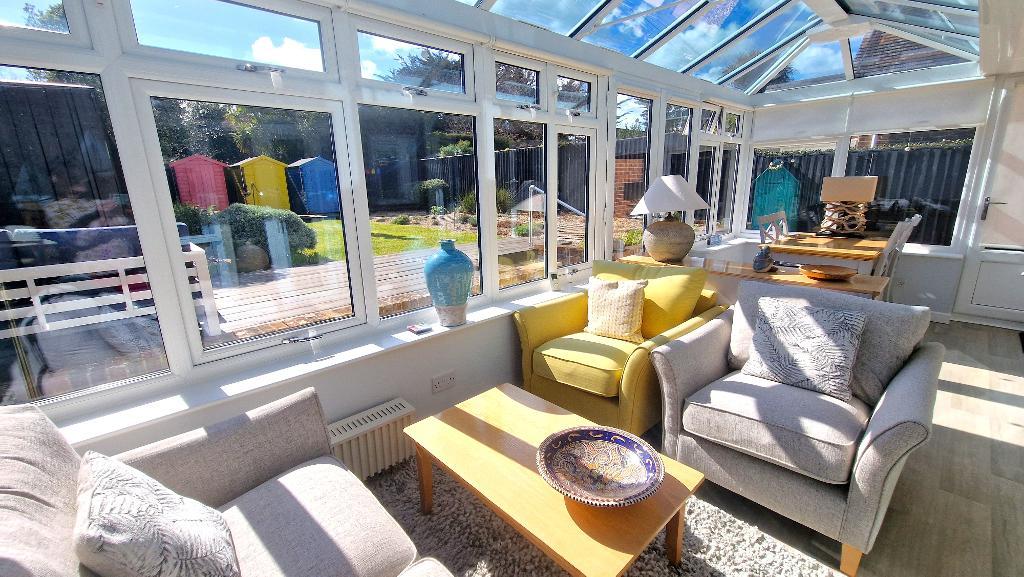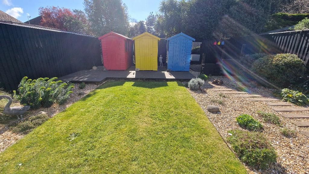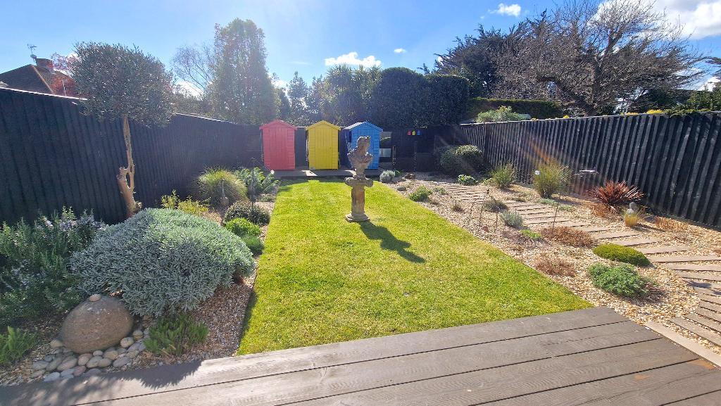 Gated side access leads through to a beautifully landscaped, southerly aspect rear garden. A paved patio area leads out from the conservatory and onto a decked terrace, which provides the perfect spot for outside dining and relaxing. This leads onto a lawned garden with coastal style planted borders. 3 timber beach hut style storage sheds, and further timber storage shed to the side. Outside tap, lighting and power points.