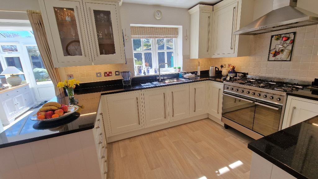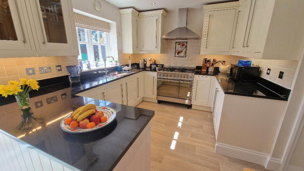 Kitchen - 9' 8'' x 10' 8'' (2.96m x 3.27m) Fitted with a wide range of wall and floor units with under unit lighting, granite work surfaces, an inset sink unit and matching upstands. Range style cooker with a cooker hood over. Integrated dishwasher and fridge. Double glazed window to the rear. Telephone point and wood effect flooring.