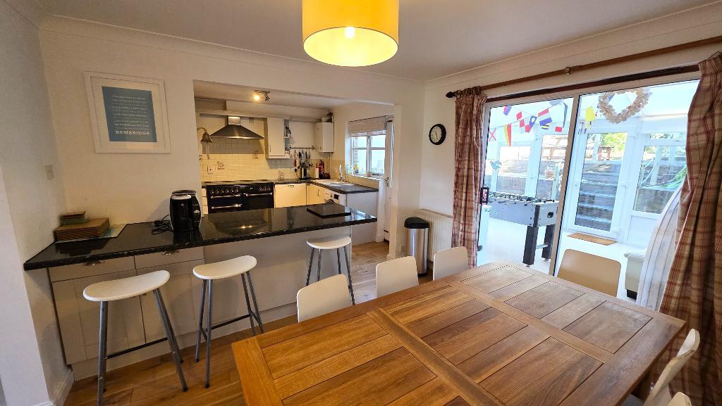 Dining Room - 11' 1'' x 10' 7'' (3.4m x 3.23m) Patio doors to the conservatory and a breakfast bar with cupboard space under. Wooden flooring. Radiator. Opens through to: