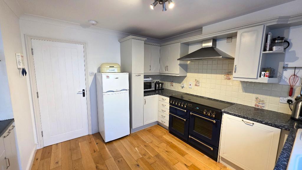 Kitchen - 11' 1'' x 9' 8'' (3.4m x 2.97m) Fitted with a range of wall and floor units with work surfaces over, an inset sink unit and tiled surrounds. Integrated dishwasher, plumbing for a washing machine and space for a fridge freezer. Space for a range style cooker with a cooker hood over. Wall mounted Worcester gas boiler. Double glazed window and glazed door to: