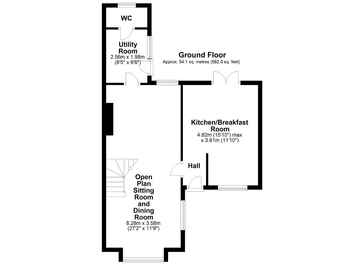 Dining Room - 25' 7'' x 11' 8'' (7.8m x 3.58m) Feature fireplace fitted with a gas log burner. Staircase leading to the first floor with a large understairs cupboard. Door leading to the utility room. Radiator and wood effect flooring.