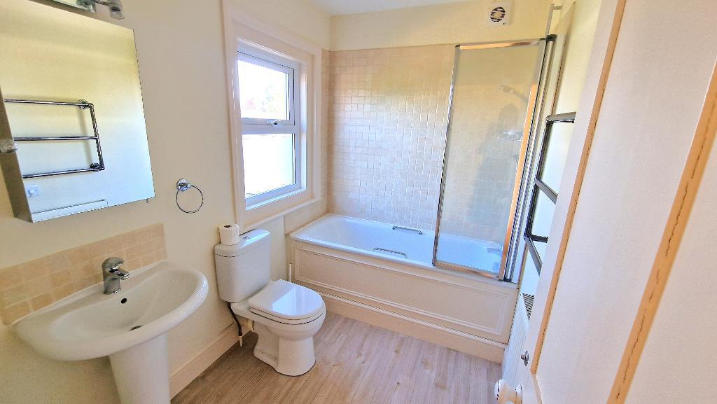 Bathroom - Fitted with a panelled bath with a thermostatic shower over and a glass screen, a wash basin and a WC. Double glazed window to the rear. Extractor fan, heated towel rail, radiator and wood effect flooring.