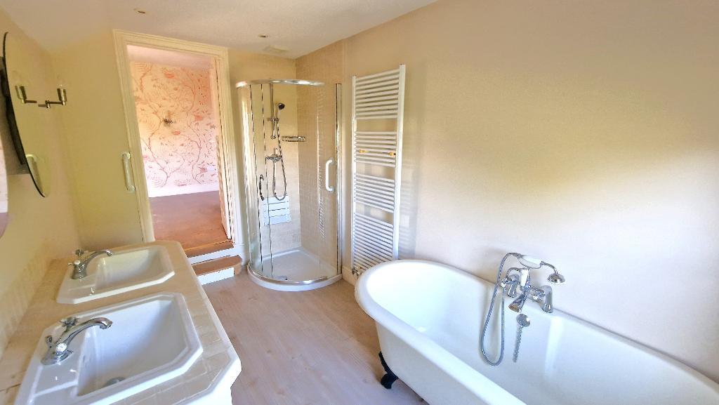 En-suite Bathroom - 12' 0'' x 6' 7'' (3.68m x 2.03m) A spacious bathroom fitted with a freestanding roll top bath, a shower cubicle, WC and 2 wash basins set in a vanity unit. Double glazed window to the rear. Heated towel rail, extractor fan and wood effect flooring.