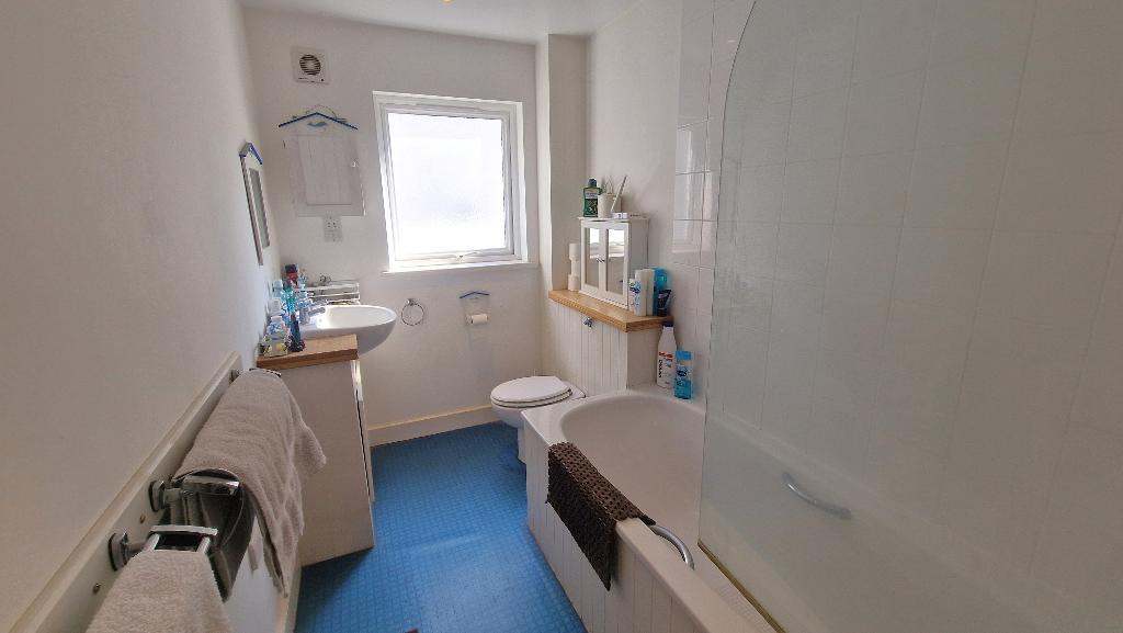 Bathroom - Fitted with a panelled bath with a glass shower screen, a wash basin set in a vanity unit and a WC set in a vanity unit. Obscured double glazed window to the rear. Built in cupboard, extractor fan, radiator and vinyl flooring.