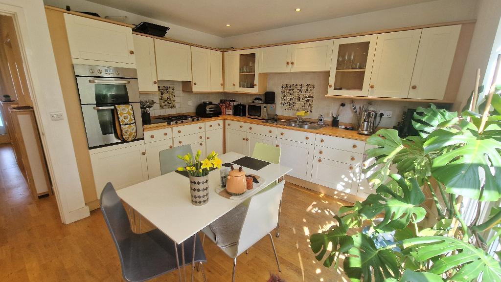 Kitchen Dining Room - 11' 8'' x 15' 5'' (3.58m x 4.72m) Fitted with a range of wall and floor units with work surfaces over, an inset sink unit and tiled surrounds. Built in gas hob with a cooker hood over, and an eye level electric oven. Space for an American style fridge freezer. Double glazed French doors and side windows giving access to the rear garden. Space for a dining table and chairs. Cupboard housing a gas boiler and a hot water cylinder. Radiator and wood flooring.