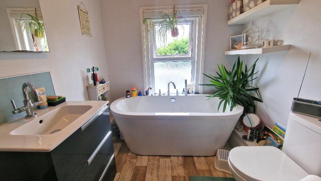 Bathroom - Fitted with a freestanding tub bath, a double sized shower cubicle, a WC and a wash basin set in a vanity unit. Double glazed window to the rear. Heated towel rail and wood effect vinyl flooring.