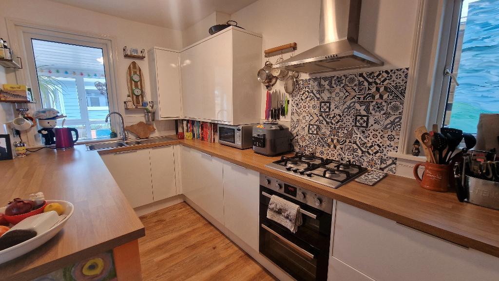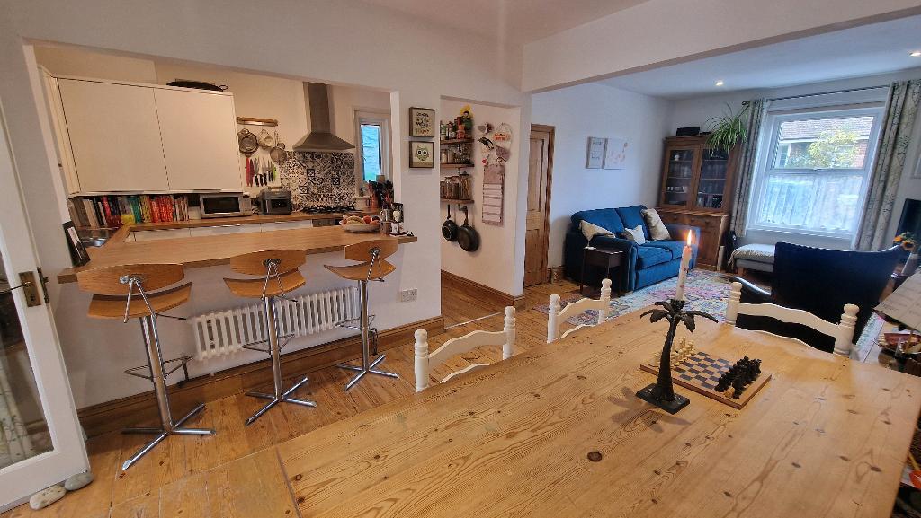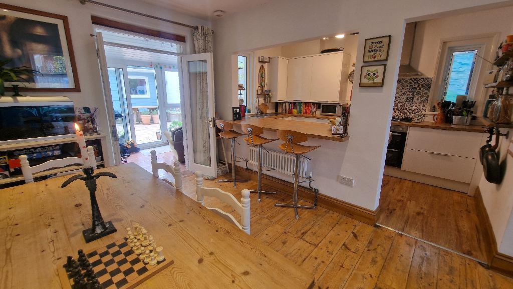 Kitchen - 12' 0'' x 6' 9'' (3.67m x 2.09m) Fitted with a modern range of wall and floor units with work surfaces over, an inset sink unit and tiled surrounds. Breakfast bar area creating a natural divide with the dining area. Built in gas hob with a cooker hood over and an electric oven under. Under counter fridge and freezer. Wall mounted Glow worm gas boiler. Double glazed windows to the side and rear. Wood effect flooring.