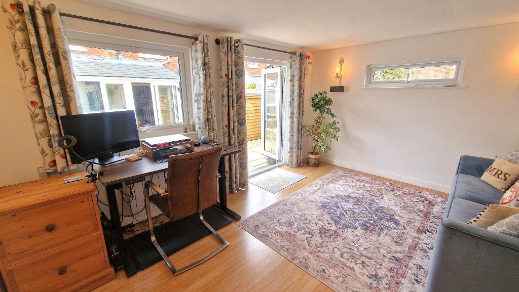 Garden Office - 10' 7'' x 13' 5'' (3.23m x 4.11m) A useful garden building which is currently used as an office but would also be ideal for use as a studio, gym, or an overflow bedroom for guests. The building is fully insulated, has power and light, double glazed French doors to the front, double glazed windows to the front and side, an electric radiator and wood effect flooring.