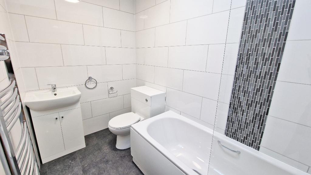 Bathroom - Fitted with a panelled bath, a wash basin set in a vanity unit and a WC. Velux window, fully tiled walls and an extractor fan. Heated towel rail and vinyl flooring.
