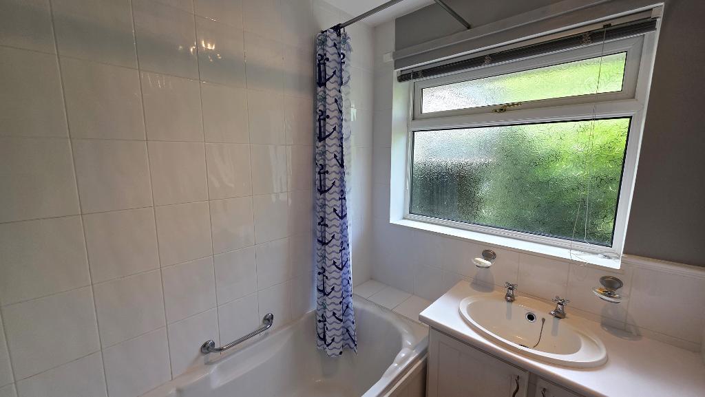 Bathroom - Panelled bath with a shower over, sink set in a vanity unit and tiled walls. Obscured doubled glazed window to the side. Radiator, shaver point and vinyl flooring.