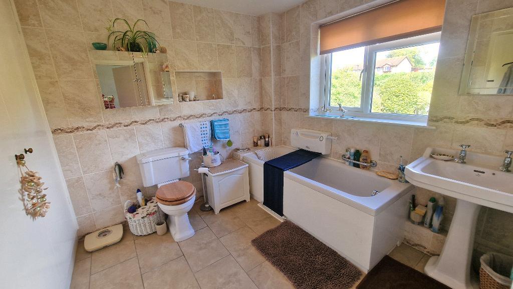 Bathroom - A generous sized room fitted with a panelled bath, wash basin and WC. Large built in linen cupboard. Window to the rear. Tiled walls and flooring, radiator. Door to: