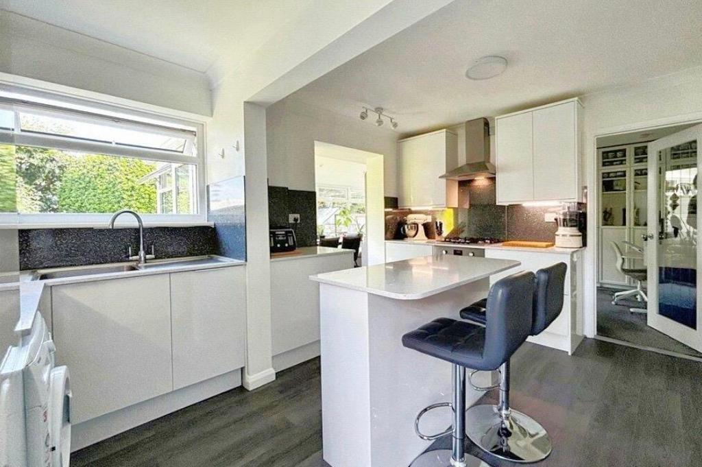Kitchen - 10' 2'' x 14' 4'' (3.1m x 4.37m) Fitted with a modern range of wall and floor units with quartz work surfaces over, and a central island with storage under. Built in gas hob with a cooker hood over and an electric oven under. Integrated fridge freezer and dishwasher. Fitted washing machine. Inset sink unit. Double glazed window to the rear and fully glazed double glazed door to the side giving access to the garden. Open through to the dining room and glazed door to the family room. Wood effect flooring.