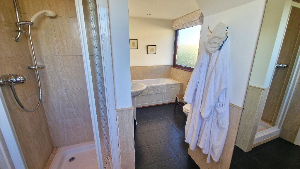 En-suite Bathroom - Fitted with a tiled shower cubicle, a panelled bath, a wash basin and a WC. Double glazed windows to the front and side. Half height tiled walls, radiator and tiled flooring.