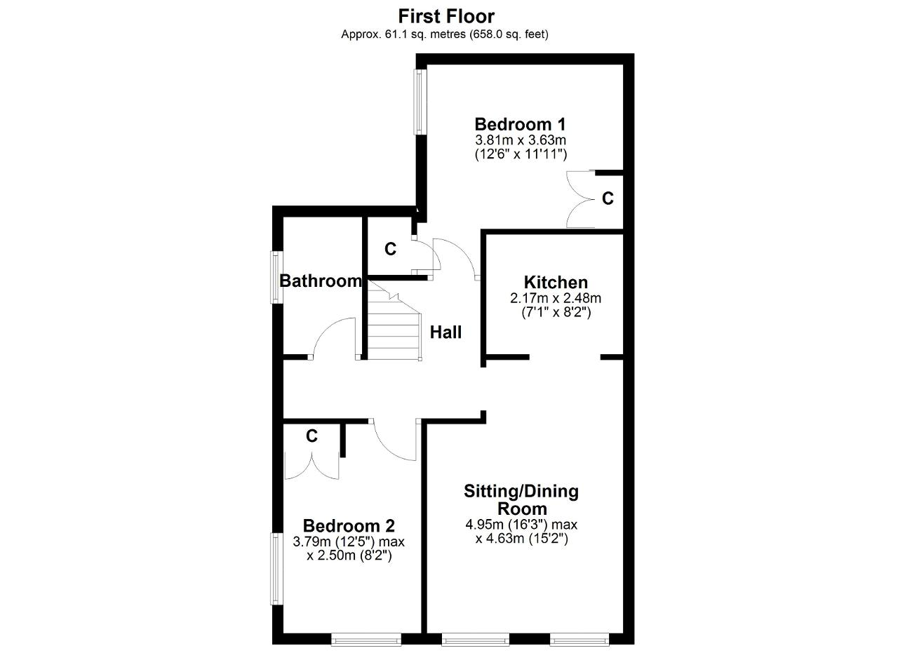 Bedroom 2 - 12' 5'' x 8' 2'' (3.79m x 2.5m) A double bedroom with double glazed windows to the side and rear. Built in wardrobe, radiator and fitted carpet.