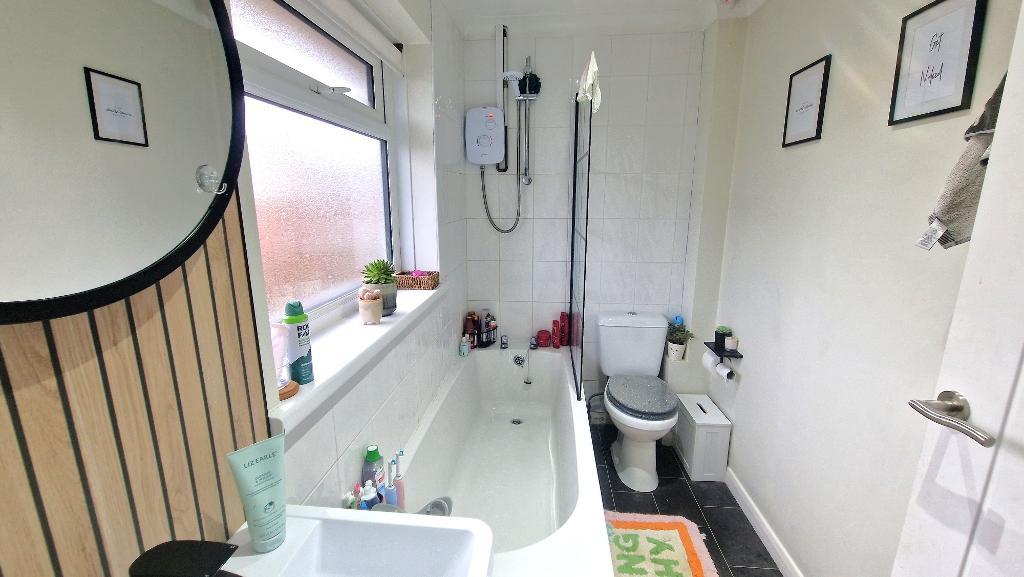 Bathroom - Fitted with a panelled bath with an electric shower over and a glass screen, a wash basin set in a vanity unit and a WC. Obscured double glazed window to the side. Tiled surrounds, heated towel rail and vinyl flooring.