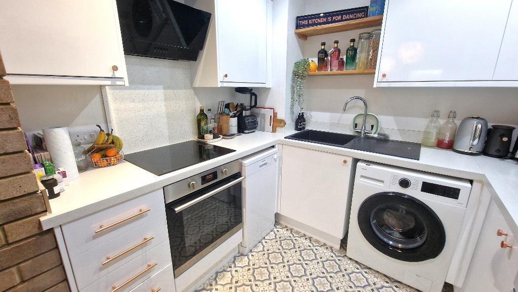Kitchen - 7' 1'' x 8' 1'' (2.17m x 2.48m) Fitted with a modern range of wall and floor units with work surfaces over, matching upstands and an inset sink unit. Built in electric induction hob with an electric oven under and a cooker hood over. Space for a fridge freezer, and plumbing for a dishwasher and washing machine. Vinyl flooring.