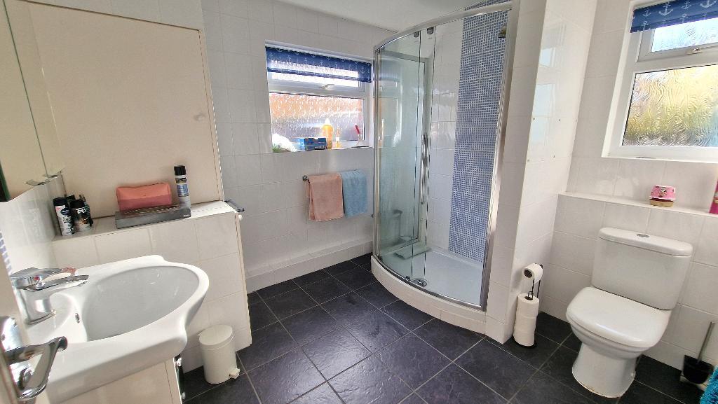 Bathroom - Fitted with a double sized shower cubicle, a wash basin set in a vanity unit and a WC. Heated towel rail and extractor fan. Obscured double glazed windows to the side and rear. Cupboard housing the gas boiler which also has plumbing for a washing machine. Fully tiled walls and floor.