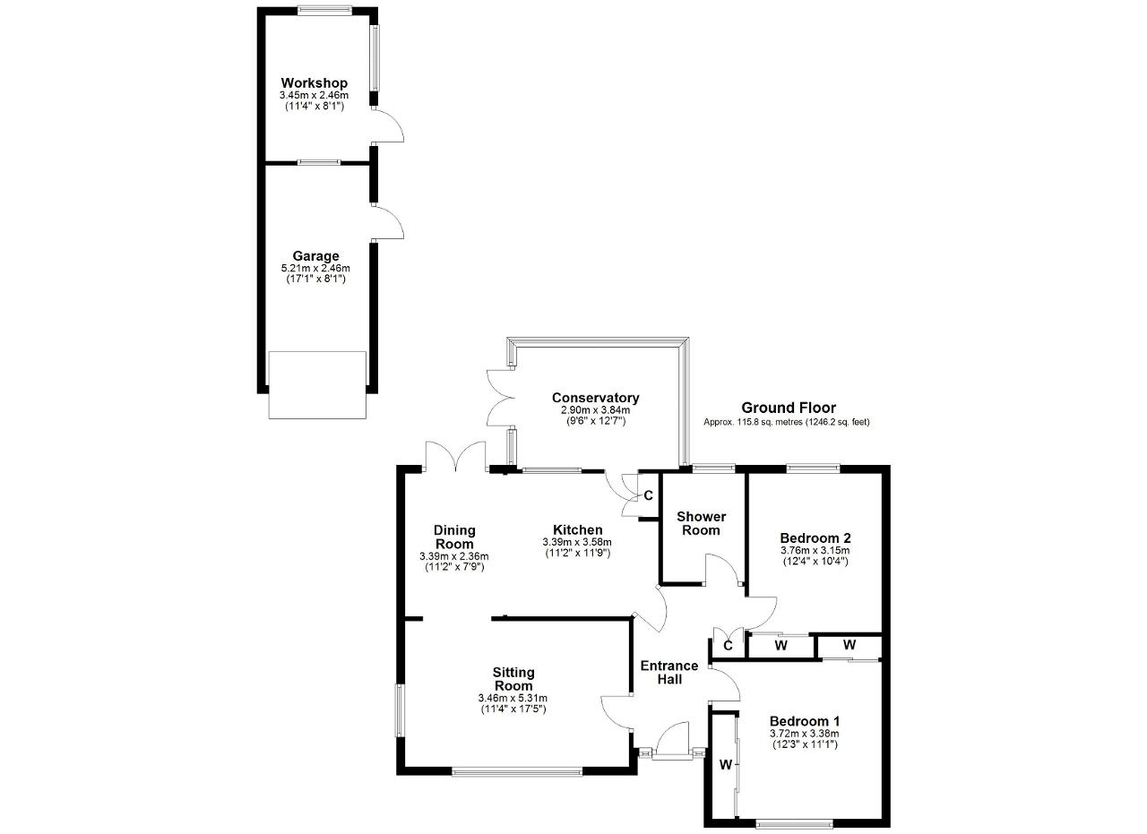 Detached Garage - 17' 1'' x 8' 0'' (5.21m x 2.46m) A detached garage with an up and over electric door to the front and a courtesy door to the rear garden. Window into the workshop. Power supply and light.