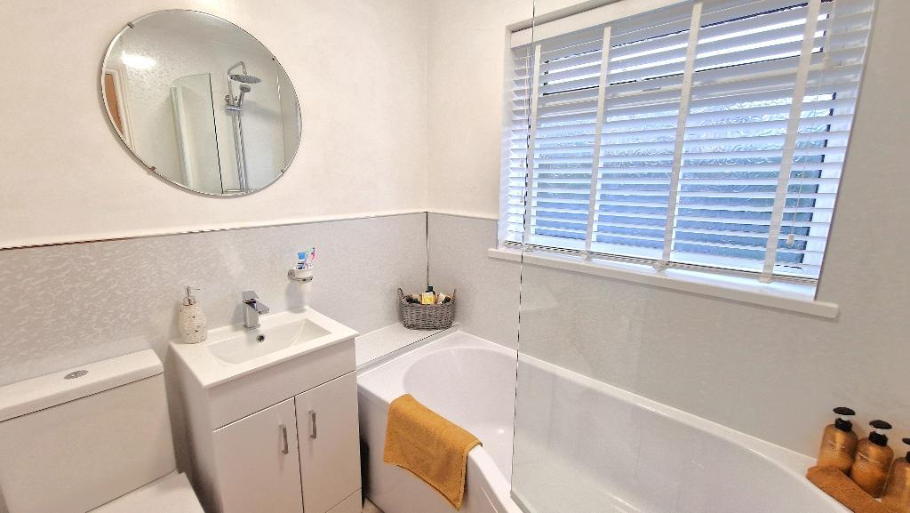 Bathroom - Newly fitted with a "P" shaped panelled bath with a shower over and a glass screen, a wash basin set in a vanity unit and a WC. Obscured double glazed window to the front. Panelled walls and vinyl flooring. Heated towel rail and extractor fan.