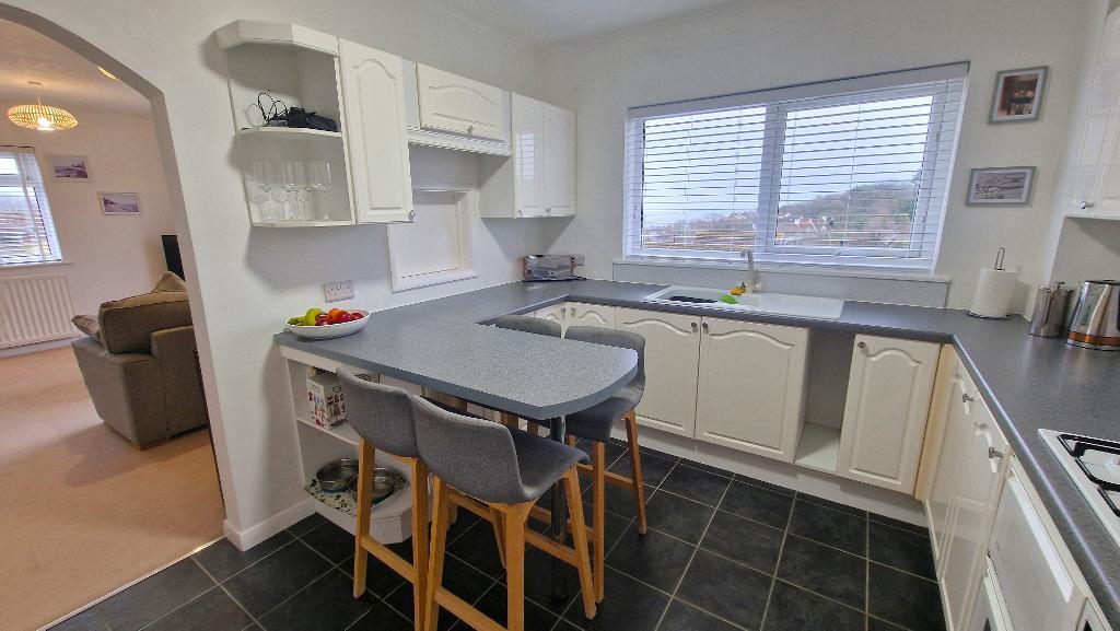 Kitchen - 10' 9'' x 9' 9'' (3.29m x 2.99m) Fitted with a range of wall and floor units with work surfaces over, an inset sink unit and a breakfast bar area. Built in electric double oven and gas hob with a cooker hood over. Double glazed window to the rear with lovely views of the sea. Tiled flooring. Door to: