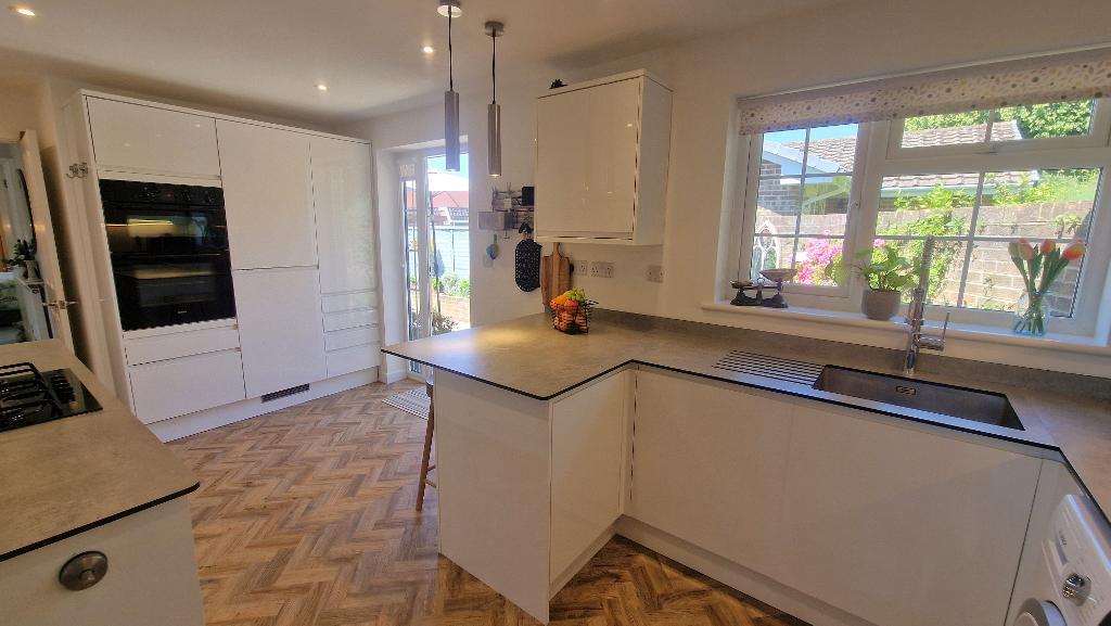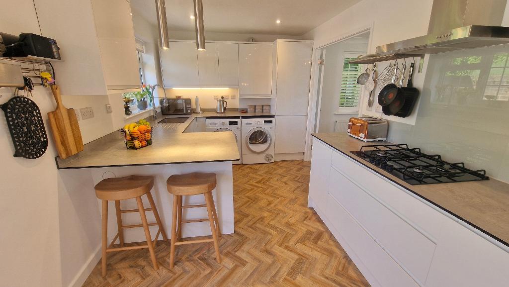 Kitchen / Breakfast Room - 8' 8'' x 20' 2'' (2.65m x 6.17m) A well designed and modern kitchen, which has been fitted with a range of wall and floor units with work surfaces over, matching upstands, an inset sink unit, a breakfast bar area and under counter lights. Built in gas hob with a cooker hood over and fitted eye level electric oven. Integrated dishwasher and fridge freezer, plumbing for a washing machine and space for a tumble dryer. Double glazed window to the rear, and double glazed door and side window giving access into the garden. Cupboard housing a Glow Worm gas boiler. Tall storage cupboard. LVT wood effect flooring.