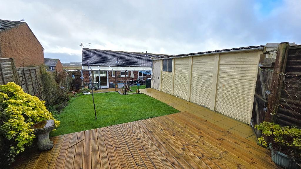 Gated side access leads through to an enclosed rear garden which has a paved patio area leading out from the bungalow. This area benefits from a covered veranda, making it the ideal spot for outside dining. Steps lead up to a second decked seating area at the rear of the garden and a lawn with planted borders. Outside tap. Rear gated access leading out to the lane from which the garage is accessed.
