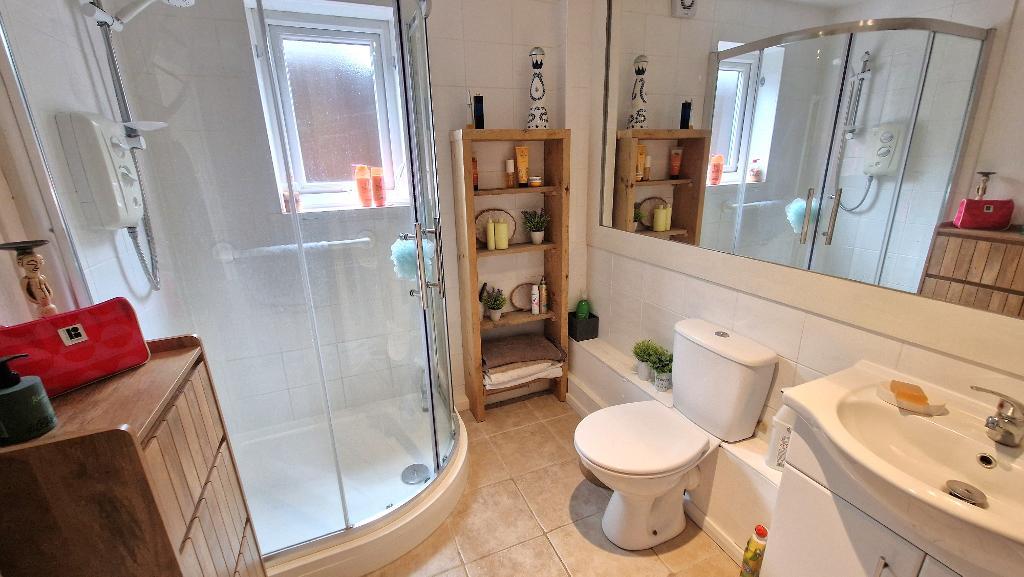Bathroom - Fitted with a shower cubicle, a WC and a wash basin set in a vanity unit. Obscured double glazed window to the side. Extractor fan, tiled walls and flooring, and heated towel rail. Airing cupboard housing the hot water cylinder.