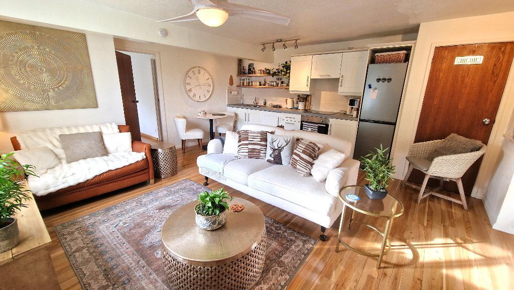 The apartment benefits from its own private entrance and has accommodation comprising an open plan living area which incorporates a sitting area, kitchen and dining area overlooking the front, a double bedroom with a built in wardrobe and a spacious bathroom.