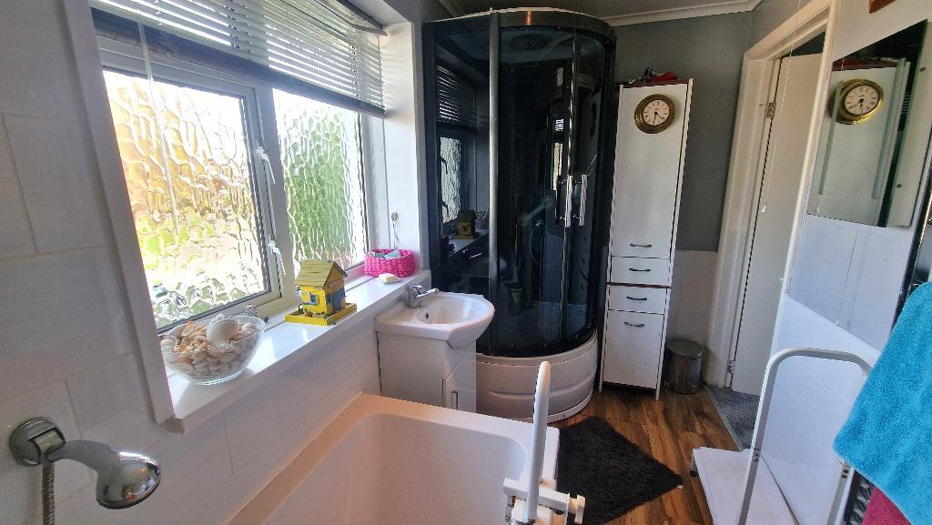 Bathroom - Fitted with panelled bath, a shower cubicle, a wash basin set in a vanity unit, and a WC. Obscured double glazed window to the front. Tiled splashbacks, heated towel rail and wood effect flooring.