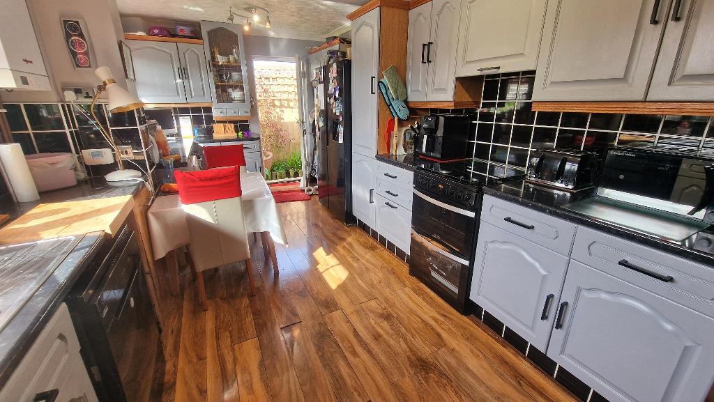 Kitchen Breakfast Room - 9' 8'' x 19' 3'' (2.95m x 5.87m) Fitted with a wide range of wall and floor units with work surfaces over, tiled surrounds and an inset sink unit. Plumbing for a dishwasher and a washing machine, gas cooker point and space for a fridge freezer. 2 double glazed windows to the rear overlooking the garden, and a double glazed door giving access to the side. Space for a table and chairs. Wall mounted gas boiler. Radiator and wood effect flooring.
