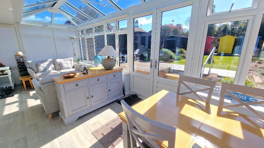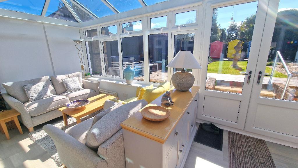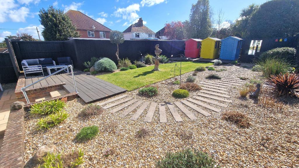 Gated side access leads through to a beautifully landscaped, southerly aspect rear garden. A paved patio area leads out from the conservatory and onto a decked terrace, which provides the perfect spot for outside dining and relaxing. This leads onto a lawned garden with coastal style planted borders. 3 timber beach hut style storage sheds, and further timber storage shed to the side. Outside tap, lighting and power points.
