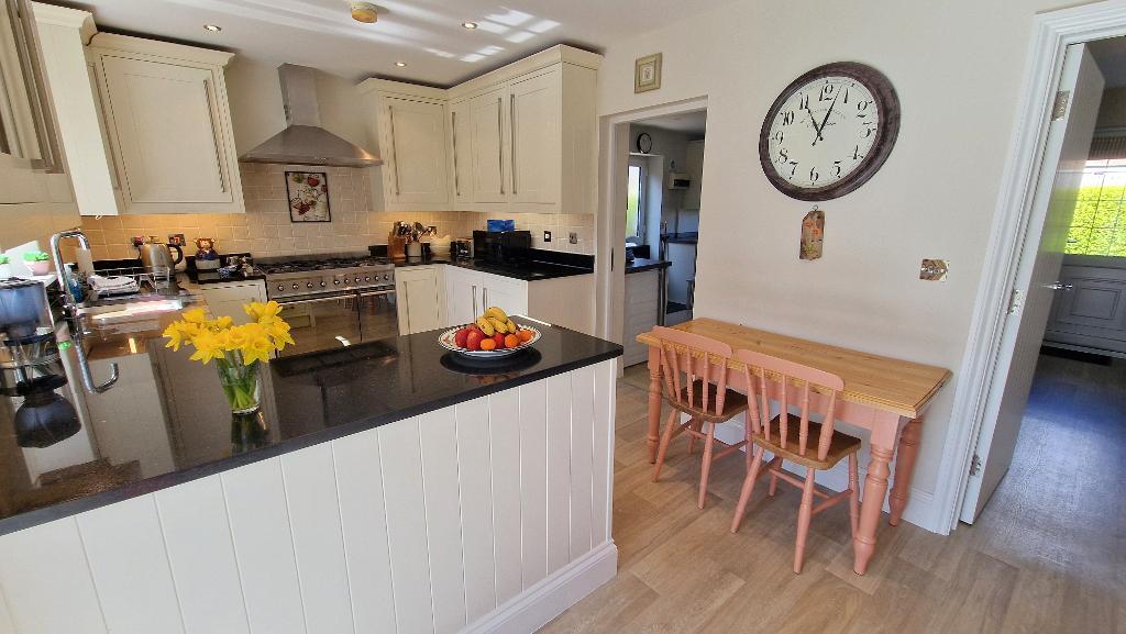 Kitchen - 9' 8'' x 10' 8'' (2.96m x 3.27m) Fitted with a wide range of wall and floor units with under unit lighting, granite work surfaces, an inset sink unit and matching upstands. Range style cooker with a cooker hood over. Integrated dishwasher and fridge. Double glazed window to the rear. Telephone point and wood effect flooring.