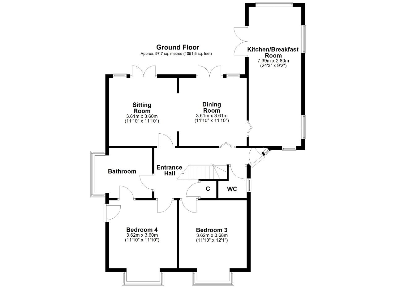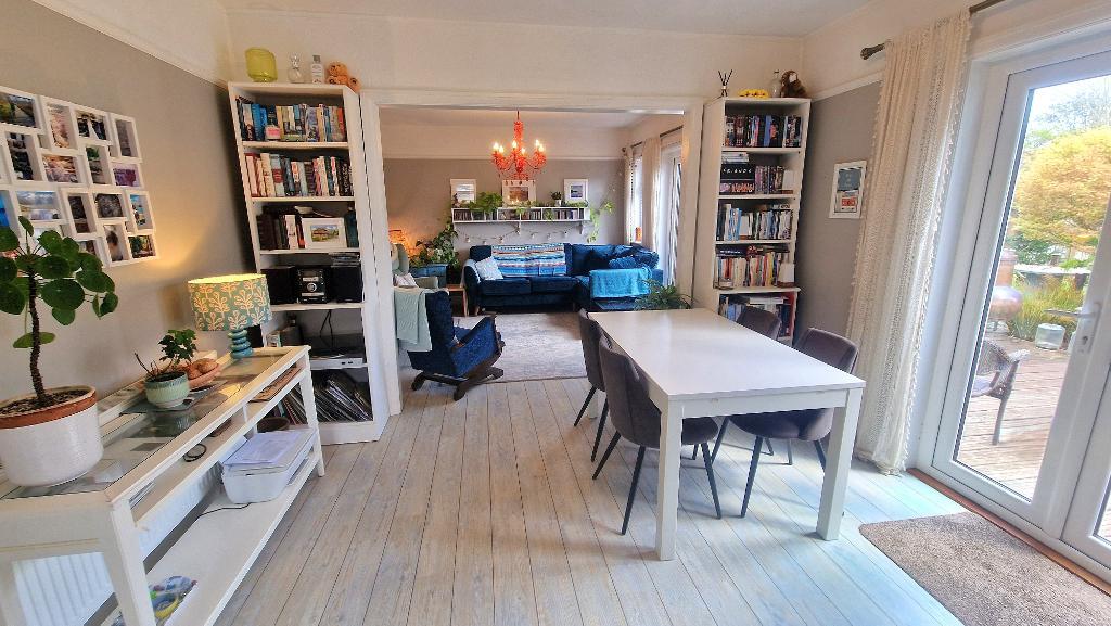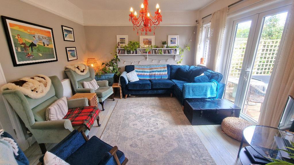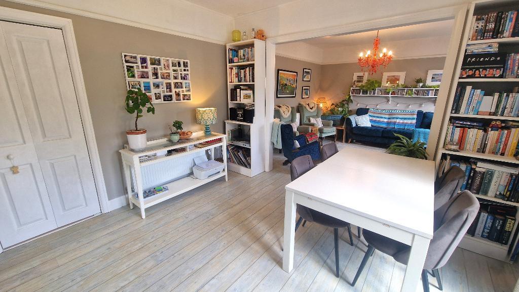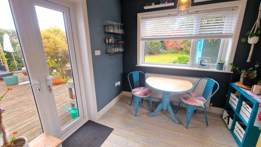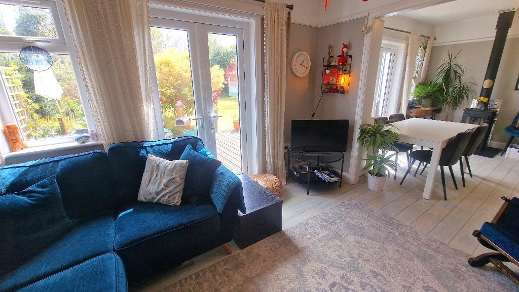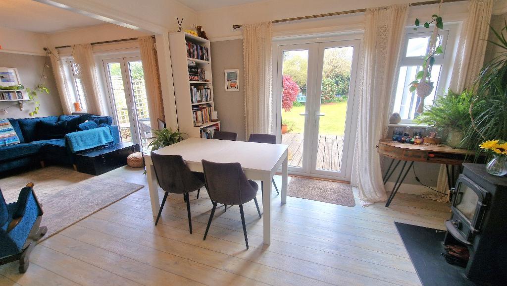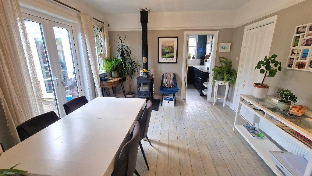 Dining Room - 11' 10'' x 11' 10'' (3.61m x 3.61m) Double glazed French doors giving access to the garden, and further double glazed window. Log burning stove set on a slate hearth. Picture rail, radiator and wood effect flooring.