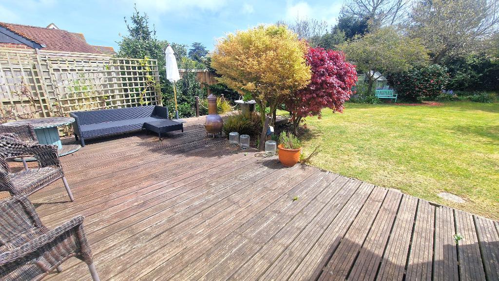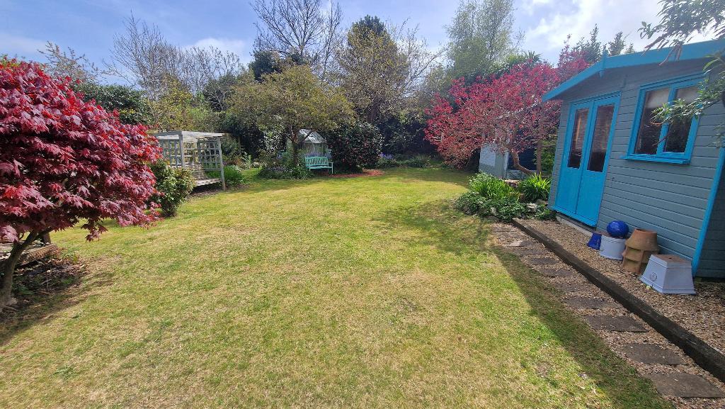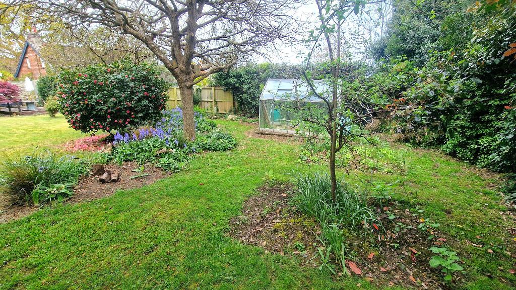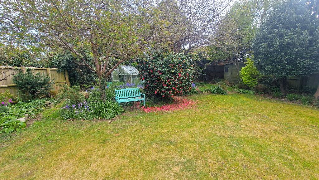 Gated side access leads through to a large southerly aspect rear garden. A decked terrace leads out from the house, providing the perfect spot for outside dining, and onto a lawn which is bordered and interspersed with mature planted flower beds and trees. Timber shed and greenhouse. Outside tap and lights.