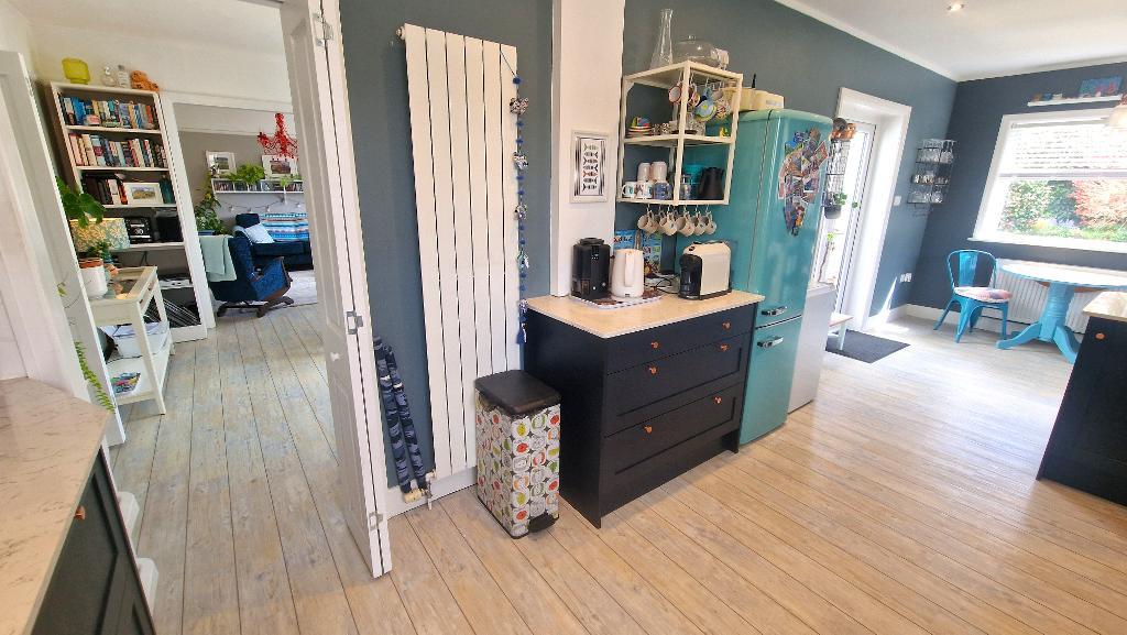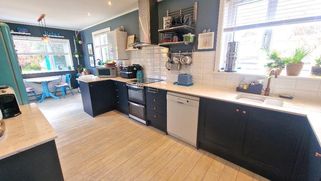 Kitchen Breakfast Room - 24' 2'' x 9' 2'' (7.39m x 2.8m) A quadruple aspect room which is fitted with a range of wall and floor units with quartz work surfaces over, tiled surrounds and an inset sink unit. Space for a gas or electric cooker with a cooker hood over, plumbing for a dishwasher and space for a fridge freezer. Double glazed windows to the front, side and rear, and double glazed French doors leading into the garden. Vaillant gas boiler, 2 radiators and wood effect flooring.