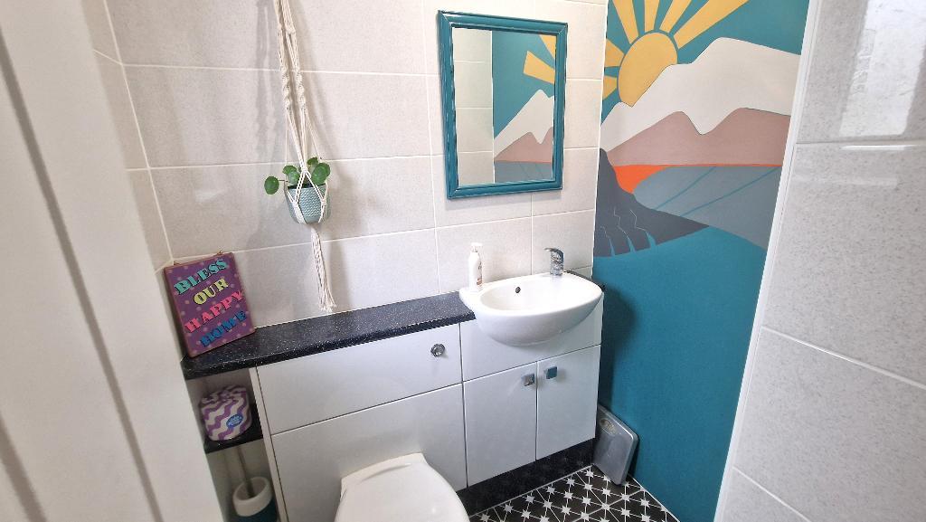 WC - Fitted with a wash basin set in a vanity unit and a WC. Obscured double glazed window to the side. Built in shelving, heated towel rail, tiled walls and tiled flooring.