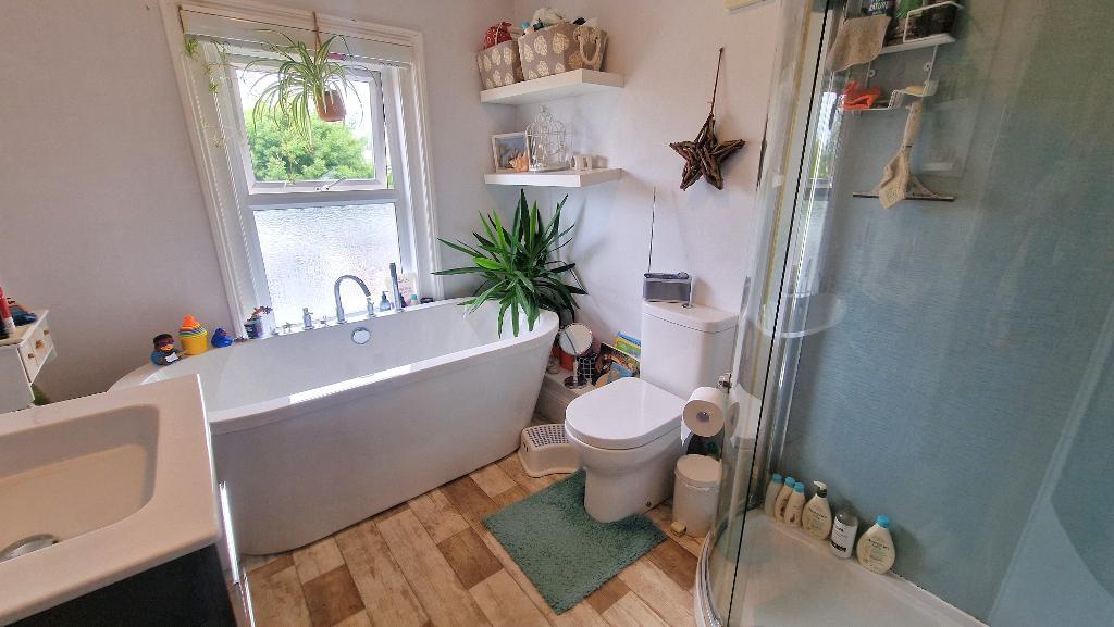 Bathroom - Fitted with a freestanding tub bath, a double sized shower cubicle, a WC and a wash basin set in a vanity unit. Double glazed window to the rear. Heated towel rail and wood effect vinyl flooring.