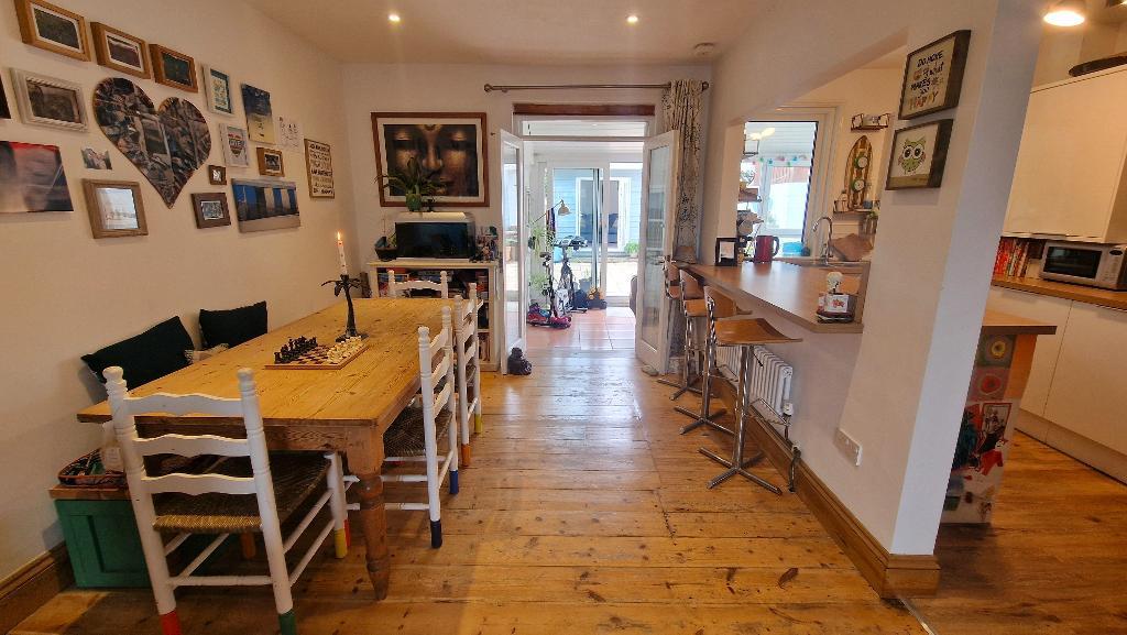 Dining Room - 12' 0'' x 10' 9'' (3.67m x 3.3m) French doors to the rear giving access into the conservatory. Radiator and stripped wooden floorboards.