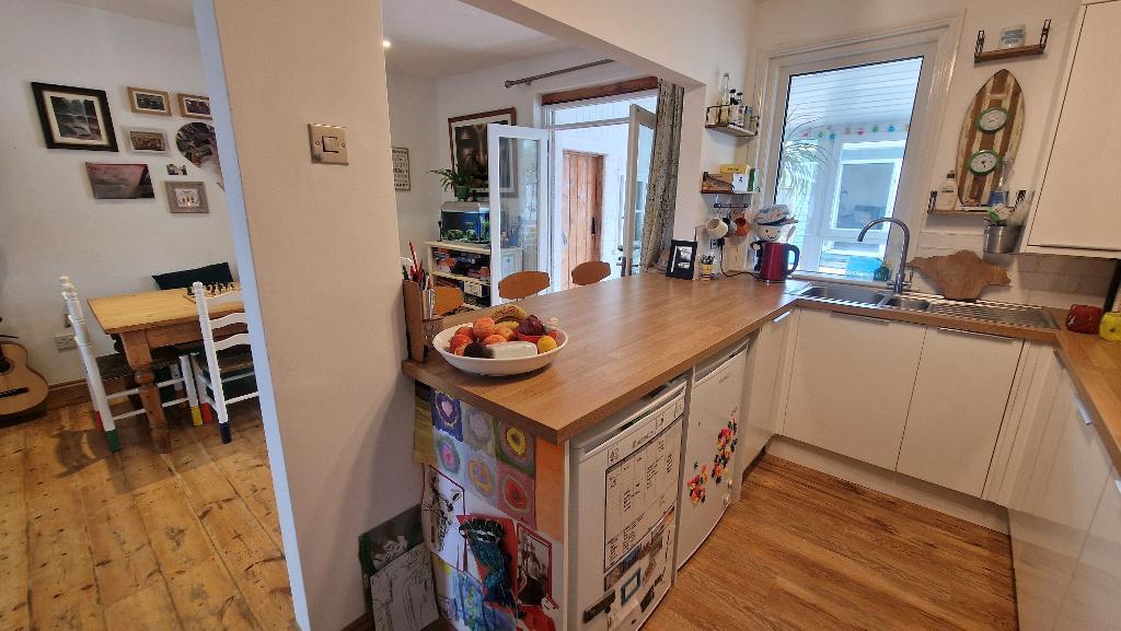 Kitchen - 12' 0'' x 6' 9'' (3.67m x 2.09m) Fitted with a modern range of wall and floor units with work surfaces over, an inset sink unit and tiled surrounds. Breakfast bar area creating a natural divide with the dining area. Built in gas hob with a cooker hood over and an electric oven under. Under counter fridge and freezer. Wall mounted Glow worm gas boiler. Double glazed windows to the side and rear. Wood effect flooring.